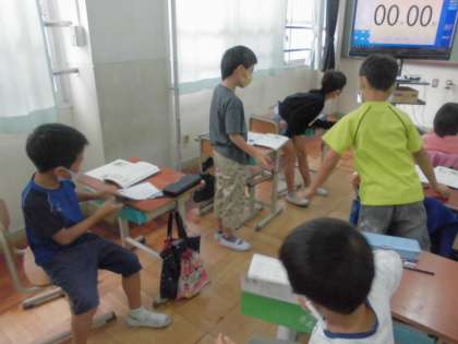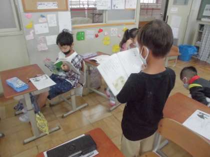 音読劇に向けて,かえるくんやかたつむりくんの気持ちを考えながら,ペアで活動をしました。声だけではなく,動きをつけて発表する予定です。楽しみですね!