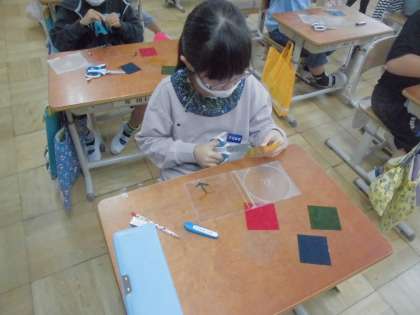 セロファンをいろいろな形に切ったり,組み合わせて貼ったりしてCDケースを飾り付けました。晴れた日に,光を通して楽しみましょう!