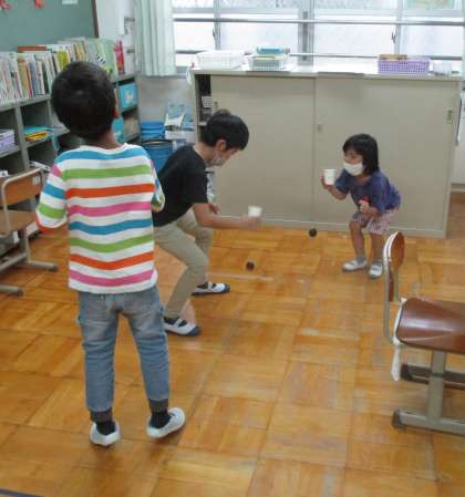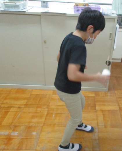 松ぼっくりをひもでくくるのが少し難しそうでしたが,しっかりとくくりつけて作っていました。できたらかざりや絵をかく予定でしたが,完成するとすぐにけん玉を始めました。どんどんやるうちにすぐに入るようになりました。ひざをうまく使ってけん玉をしていて,テンポよく入るようになると,数を数えながらやっていました。