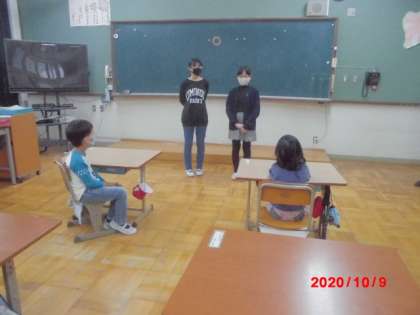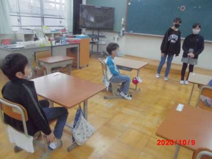 「すきな給食は何ですか?」「ごはんとパンはどちらが好きですか?」「すきなくだものは何ですか?」の3つの質問に一人ずつ答えることができました。