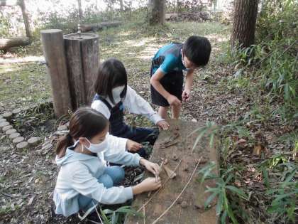 どんぐりや落ち葉,木の枝などの材料を集め,各班に分かれて,小人のすみかをつくりました。