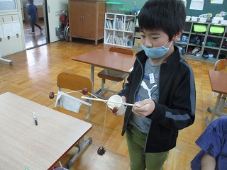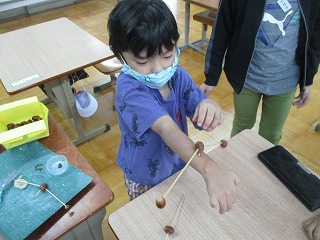 校庭で拾ってきたどんぐりを使って「やじろべえ」を作りました。空けた穴に竹ひごをさしてバランスをとります。うまくバランスがとれるようになると,とても嬉しそうに指の上やわりばしの上にのせてゆらゆら動かしていました。秋を感じる遊びですね。