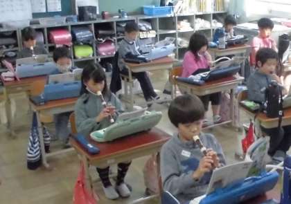 音楽の学習で,「ゆかいな木きん」という曲を演奏しています。