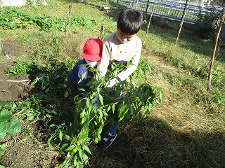 3組の畑で大切に育ててきたさつまいもを収穫しました。まずは,つるをとりました。たくさんのつるでいっぱい。つるを取るといよいよ芋を掘ります。大きな芋が掘れるかな。とても楽しみです。