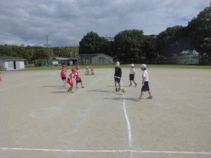 準備運動をした後で,試合を2試合行いました。同じチームで声をかけ合い,パスをつないでゴールを目指すことができました!