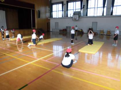 ねらい1では,連続技や組み合わせ技をしました。班の友だちにまっすぐになっているかや途切れていないかをみてもらいしました。