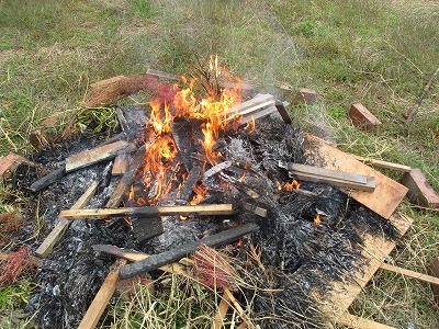 畑に行くと,けむりがあがっていて子どもたちもワクワクしている様子。アルミホイルをまいたおいもを火の中に一人一人入れました。その後,わらを入れて火を強め,焼き上げていきます。