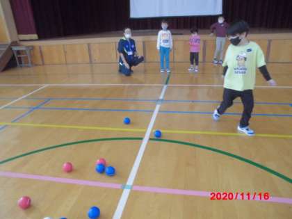 赤チームと青チームに分かれてボールを投げました。ジャックボールを目指して力を加減したり,相手ボールに当てて遠ざけようとするなど,少し工夫も見られました。