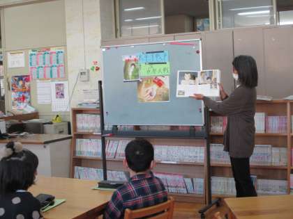 司書教諭の大藪先生から,図書室で「戦争」に関わる本の紹介や読み聞かせを聞きました。