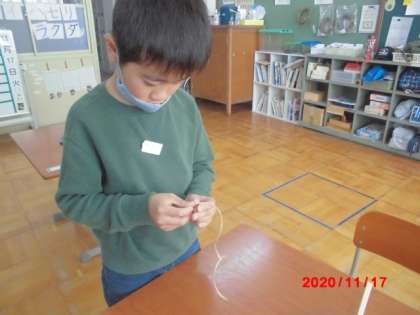 この間拾ってきたアラカシのどんぐりを使ってでんでんだいこを作りました。お皿にどんぐりがうまく当たるようにひもの長さを考えながら,つけていました。