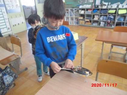 できあがると,さっそく友だちと一緒に鳴らして楽しそうでした。