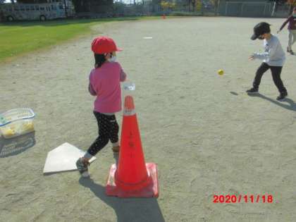 今日は,ハンドベースボールに挑戦しました。打者は,コーンの上にあるボールをよく見て手で打ちます。打った後は,すぐにベースに向けて走ります。守る人は,ボールを取ったらすぐにベースを踏みに行くというルールでやりました。だんだんと打つことが上手になり,自分が打ちたい方向へ打っていました。打ったり,走ったり,ボールを取ったりといろいろな動きができて楽しそうでした。
