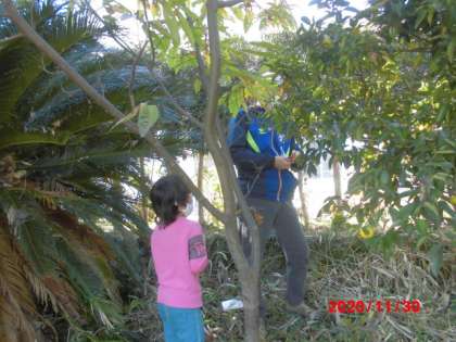 畑の近くにゆずの木があります。この間まで緑色だったゆずの実が黄色く色づきました。今日はゆずの実を収穫しました。ゆずの木にはするどいとげがあるので,先生がとった実を子どもたちがはこにつめてくれました。実を手にもつとすぐに,「いいにおい。」とにおいをかいでいました。