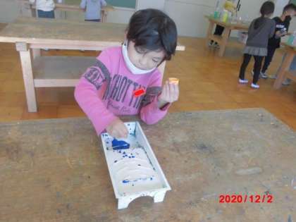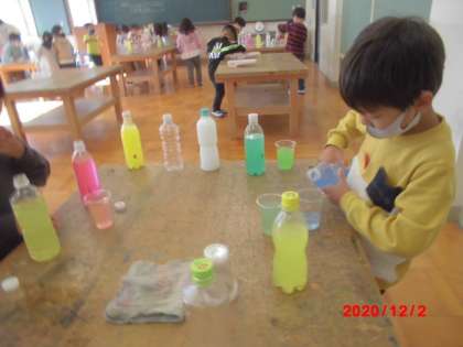 ペットボトルに水を入れて,ふたの裏に綿棒で絵の具をつけ,ふたをしめてよくふると,きれいな色水が出来上がりました。「こんないろ,見て。」と出来上がった色水を見せてくれました。透明のコップに移して,他の色の色水とまぜると色がかわっていくので,どんどんまぜていました。時間がすぎるのに気づかないほど夢中に色水を作っていました。