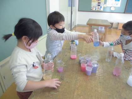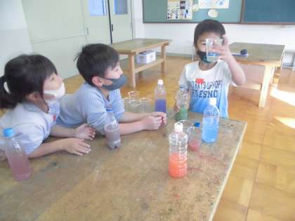今日は絵の具を使って色水を作りました。