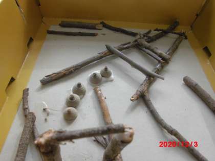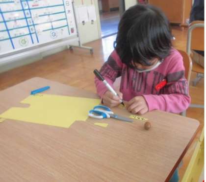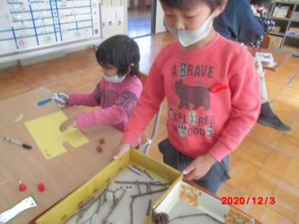 1年生は生活の学習で作った秋のおもちゃを修理したり,おもちゃに障害物をつけたりしました。どんぐりころころゲームは,もう少し難しくなるようにまつぼっくりやどんぐりのぼうし(がくと)を付け足したり,どんぐりごまは,われたどんぐりをかえて新しいどんぐりごまにしたりしました。