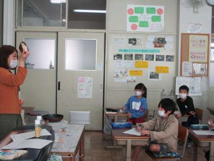 国語「すがたをかえる大豆の学習の導入として,栄養教諭の薄刃先生に,大豆が様々な食材や食品に変化する様子を見せていただきました。