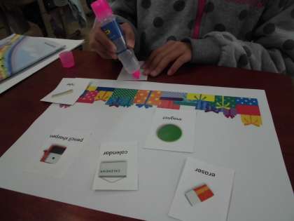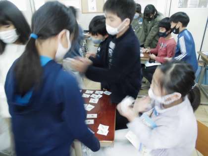 文房具セットを作るために,子どもたちがお店屋さんとお客さんになり,「Do you have a pen?」,「Yes, I do. Here you are.」などとやり取りをして,友達に贈る文房具セットを作りました。