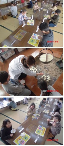 2年生と5年生が稲刈りをして収穫してくれたお米で,3年生も五平餅を食べました。