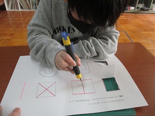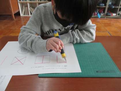 2年生の図工で初めてカッターナイフを使いました。画用紙の線に沿って切ると窓のように開きます。初めはうまく力が入らなかったり,線からずれてしまったりしましたが,練習する中で少しずつこつが分かってくるようでした。もうすぐ,カッターナイフを使った作品作りに取り組みます。興味をもってできるといいなあと思います。