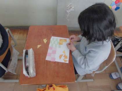 三角形や四角形を使って,もようづくりをしました。組み合せを変えると,いろいろなもようができることに気付けました!