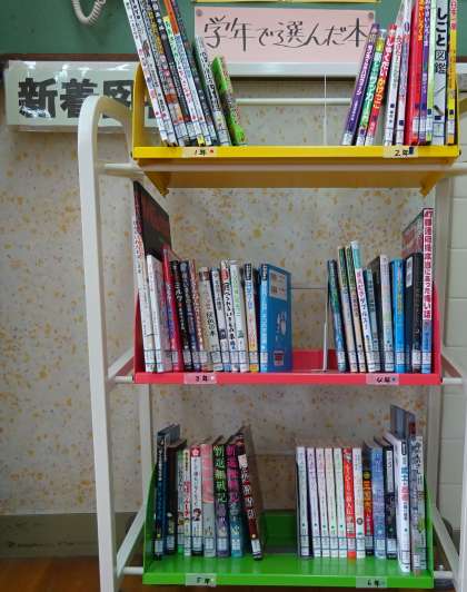 学年のみんなで選んだ本を図書室に配架しました。背表紙に,学年カラーの○か□を貼っています。他の本も合わせて165冊の新着本と一緒に並べてあります。連休明けから貸出も始めます。さざんか読書は1月18日から2月12日です。
