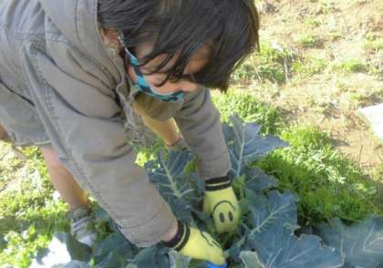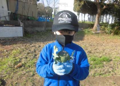 3くみのはたけで育てていたブロッコリーとカリフラワーを収穫しました。自分の顔くらいの大きさのカリフラワーにびっくりしていました。ブロッコリーのくきの横からも小さなブロッコリーがたくさんできていました。