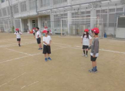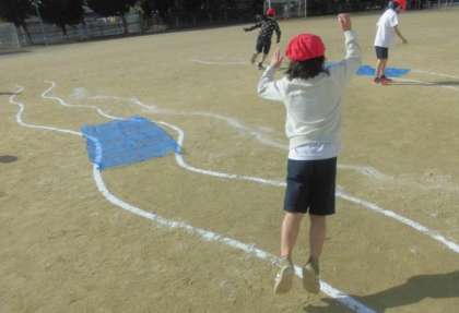 1年生は,体育の学習で「とびあそび」をしています。グリンピース,川とび,ゴムとびなどいろいろなとびあそびに挑戦します。