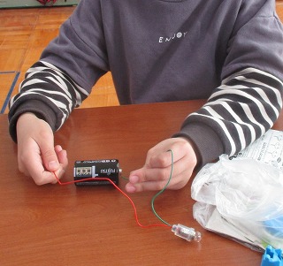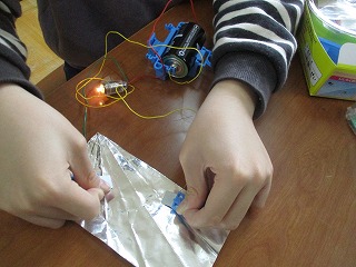3組の3年生では,乾電池に導線と豆電球をつなげて明かりをつけたり,あかりのつくものとつかないものを調べたりしました。銀の折り紙で明かりがついた時には「わあ!ついた」と驚いた様子。興味いっぱいで学習しています。