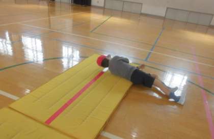 1年生はマットあそびをしています。今日はさかのばやさめのばなどで,「まるたごろごろ」や「まえころがり」などをしました。坂になっているのでゴロンゴロンとはやく回っていました。
