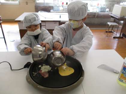 畑で育てているブロッコリーと九条ねぎをつかっておこのみやきをつくりました。朝一番にブロッコリーとねぎを畑に取りに行きました。家庭科室へ行って,さっそく料理を始めました。手洗い・消毒の後,一人分ずつの材料を混ぜます。