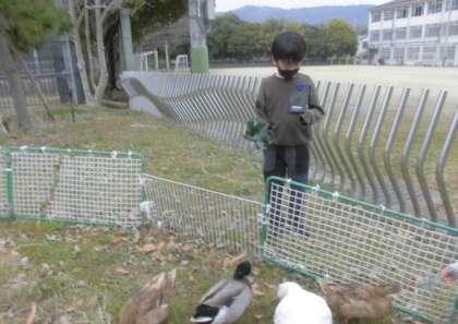3くみ あいがもにえさをあげたよ