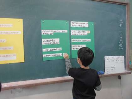 栄養教諭の薄刃先生から,食べもののはたらきについて授業をしていただきました。夢を叶えたり,素敵な3年生になったりするために,バランスよく食べることを心掛けていきたいですね!