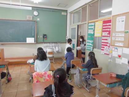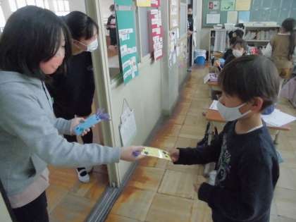 6年生からプレゼントをもらいました。いくつかプレゼントをもらいましたが,その中でも,たてわりグループで同じだった6年生から一人ひとり直接しおりをもらったときに嬉しそうな笑顔があふれていました。