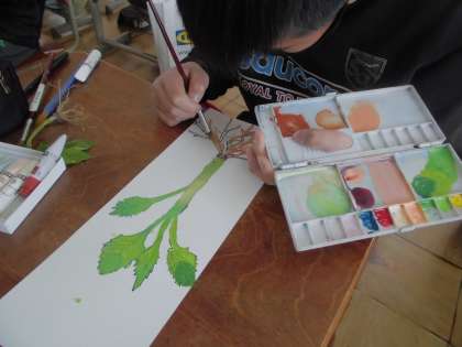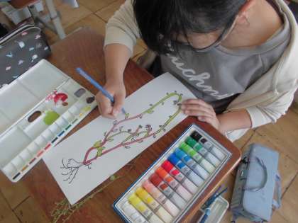 絵具のチューブから出た色と,自然の色との違いを見つけます。