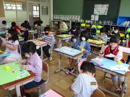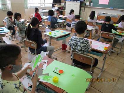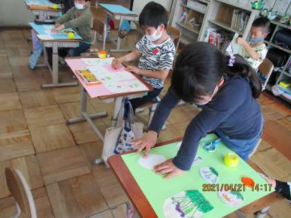 今日の図工では,先週見つけた春を大きな画用紙に貼って