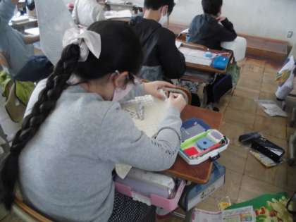 家庭科の学習でナップザック作りをしています。