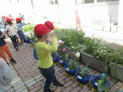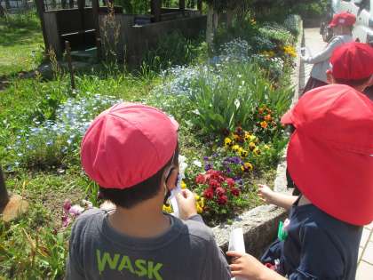 実際に校庭に出てみて,「やっぱりお花がたくさん咲いている!」「いろいろなお花があるね」「虫もいるね」と,知っていることを確かめたり,新しく発見したりしていました。