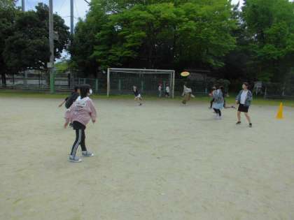 今日はドッチボールとドッチビーを混ぜた「ドッチモ—」を学年で楽しみました!