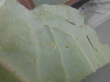 キャベツの葉の裏に黄色くて小さいモンシロチョウの卵が4つ見つかりました。