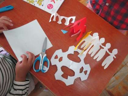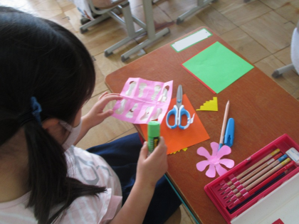 はさみの安全な使い方を学習して,子どもたちは色々な形の飾りをつくっていました。
