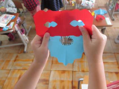 「こんなおもしろい形ができた!」」「ここに穴があくんやな」「重ねたらおもしろい!」等,たくさんのことに気付きながら,考えてはさみを進めていました。