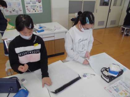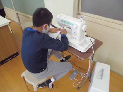 休み時間も使って,自分のためのナップザックを作っています。