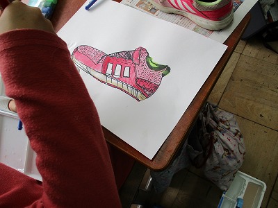 図工の学習で自分の靴を描いている4年生。子ども達は,色塗りにチャレンジしています。薄い色を作るのに試行錯誤しながら頑張っています。同じ色でも水の量を少し変えるだけでとても雰囲気が変わりますね!