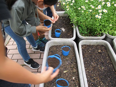 理科の学習でツルレイシの種を植えました。個人用のポットに丁寧に植え,各班で育てていきます。これから毎日の水やりを大切に育てていきましょう!