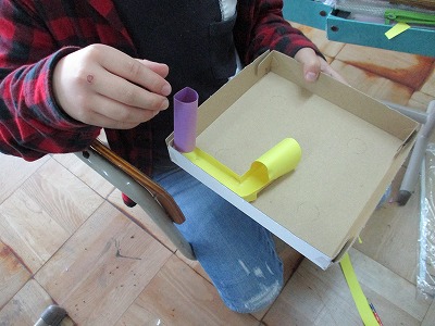 図工の学習で「コロコロガーレ」をしている4年生。今日は,デザイン画をもとに作品作りを始めました。ビー玉を転がすためのいろいろなコースを試行錯誤しながら作りました。これからどんな作品が出来上がるかとても楽しみですね。