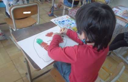 2年生は図工の交流学習で「ふしぎなたまご」を描きました。自分のすきなくわがたやくだものなどを模様のように描いていました。