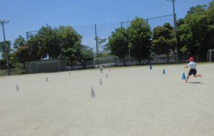 2年生は,体育でリレーあそびをしています。くねくねリレーを2チームで対戦しました。相手チームと競争しながら,はやく走ろうとがんばっていました。