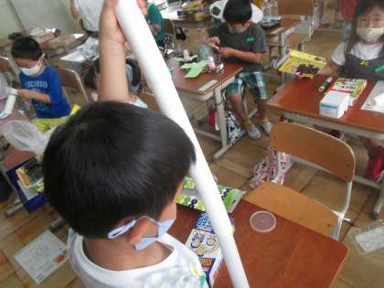 できあがった作品を見て,「ぶーん」と手でもって飛ばす子もいれば,他の子の作品と一緒にお話ししているように並べている子もいました。