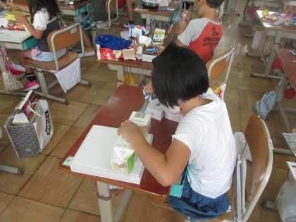 「はこのかたちを見て,何を作るか考えよう」「どんなんにしようかな」と,それぞれ集中して作っていました。